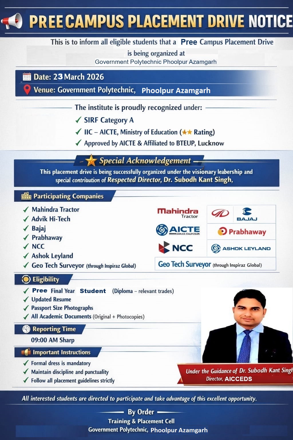 More on admissionA Campus Placement Drive will be held on 23 March 2026 at Government Polytechnic, phoolpur pavai, Azamgarh. Under the leadership of Dr. Subodh Kant Singh, the drive includes companies like Mahindra Tr